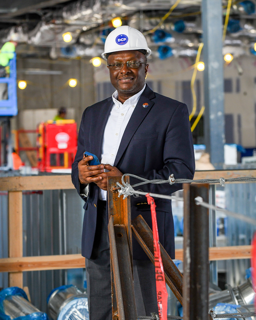 For Anumba, the building’s homecoming debut is particularly symbolic. The college’s wood shop is relocating from the Fine Arts Building. The Fabrication Lab, once housed in quarters a half-mile away, will also have a new home. A construction robotics lab is getting a prime, ground-floor spot.