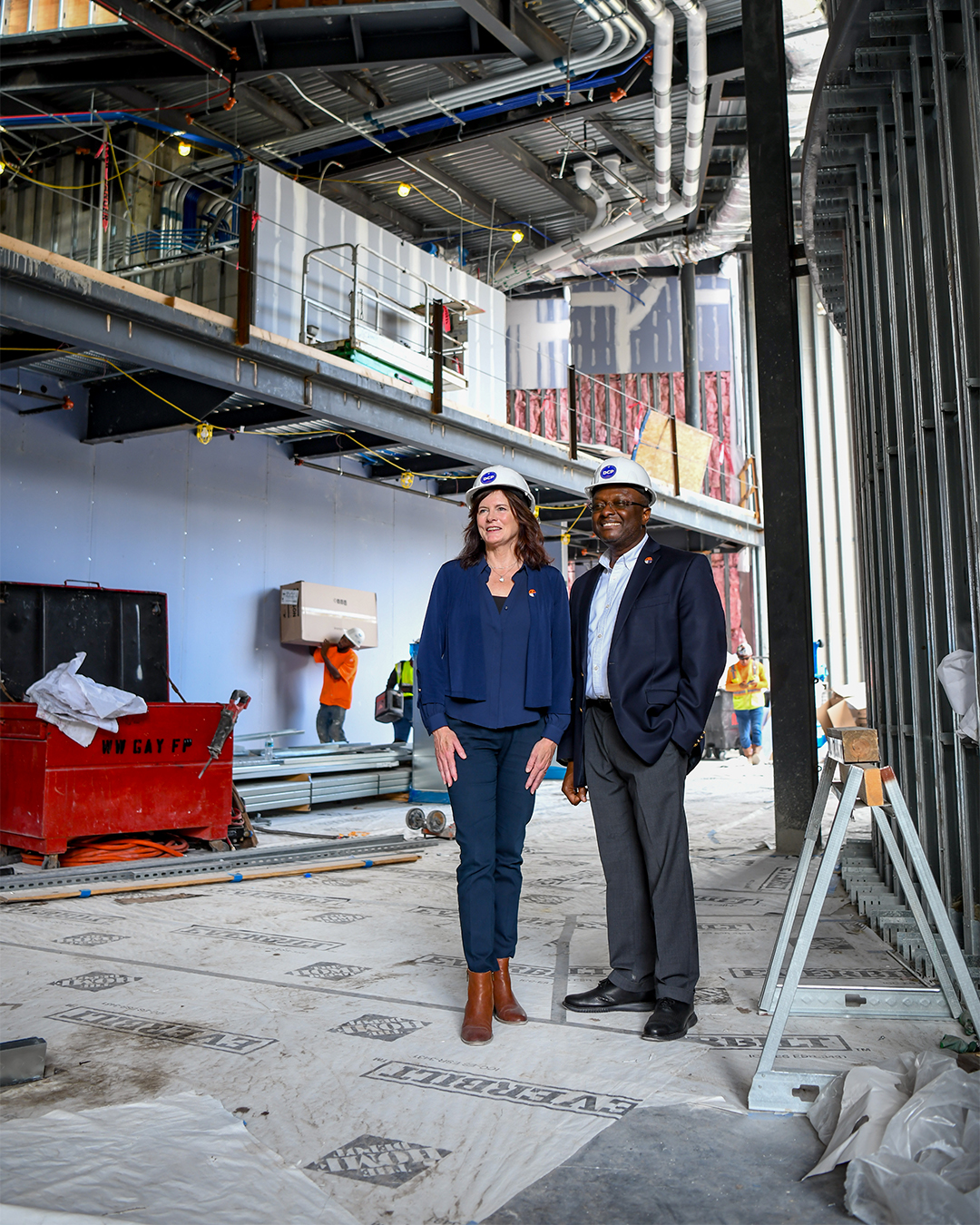 Pictured on the right: Construction work at the Bruno E. and Maritza F. Ramos Collaboratory.